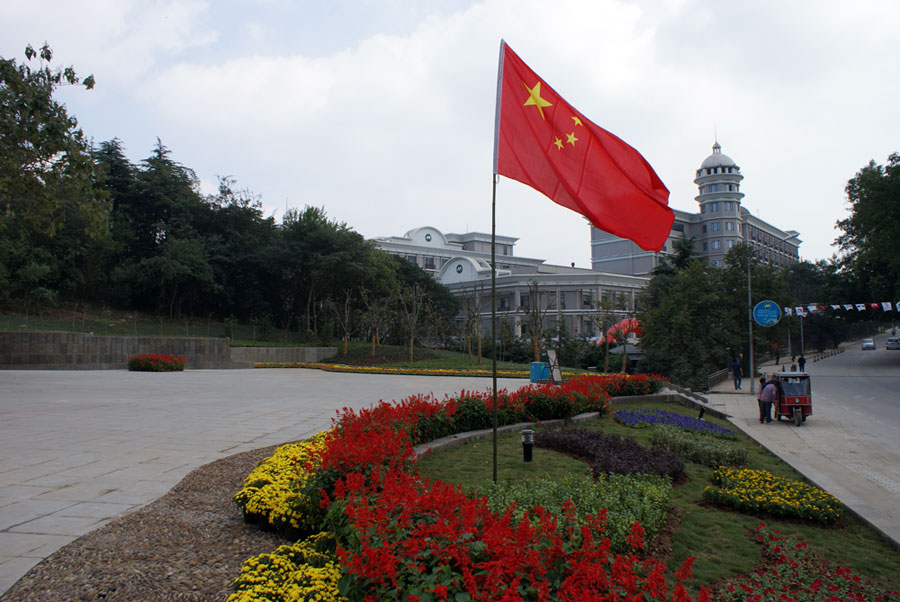 Флаг Китайской Народной республики впервые поднялся ровно 60 лет назад - 1 октября 1949 года. Пять звезд на нем означают могущество китайского народа под руководством КПК. Сейчас за этим знаменем мы видим “Mingfa Pearl Spring Hotel”, ставший на две недели центром внимания всех влюбленных в древнюю игру.