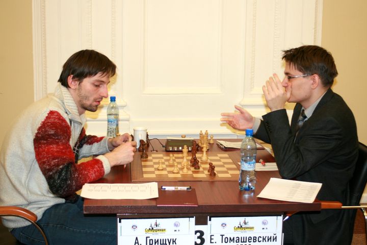 Евгению Томашевскому в первом туре выпало играть черными с Александром Грищуком. На 15 ходу Евгений применил новинку, но уравнять игру не удалось.