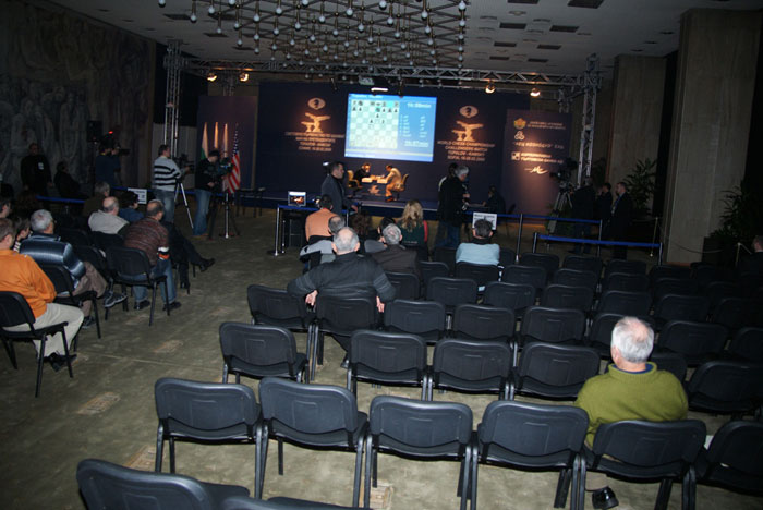 Что касается болельщиков, то тут господин Сергиев немного ошибся. Уже в ходе 5-й партии, а так же во время 6-й, в зале №6 появился первый неболгарский болельщик. Это Антон Губанов из Питера, двукратный чемпион мира по игре "Что? Где? Когда?", автор ChessPro (публикация "Шахматы острова Льюис"). Сутовский про него сказал так: