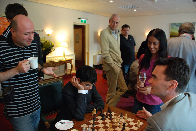 Напротив Любоевича – отец Йеруна Пикета, увлеченный шахматист, когда-то играл в первенстве Голландии. Очевидно, Любо в приватном порядке демонстрирует свою победу над Со. С Хауэллом дебют был тот же, но не будет же уважающий себя гроссмейстер показывать проигранную партию! |