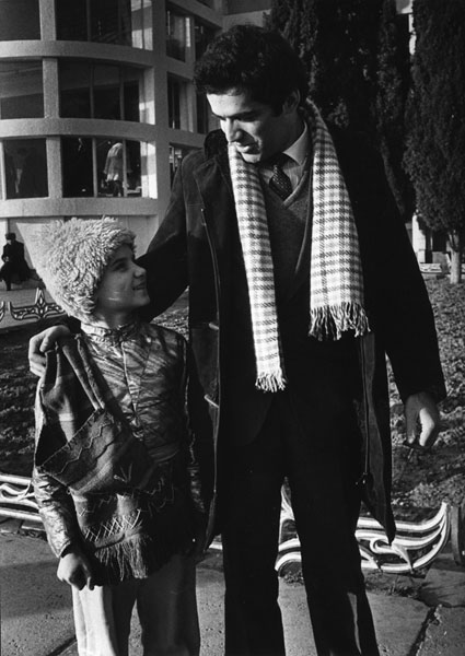 4 января 1984 года. Бакинский аэропорт. Возращение после победы над Корчным. Каспарова встречает неунывающий «пастушонок Джиртдан» (школьник Натик Гаджимаров) – самый популярный сказочный герой у азербайджанских детей. Когда Гарик принял участие в блицтурнире со взрослыми кандидатами в мастера, ему было еще меньше лет, чем этому мальчугану… Фото А.Тавакалова (Азеринформ). |