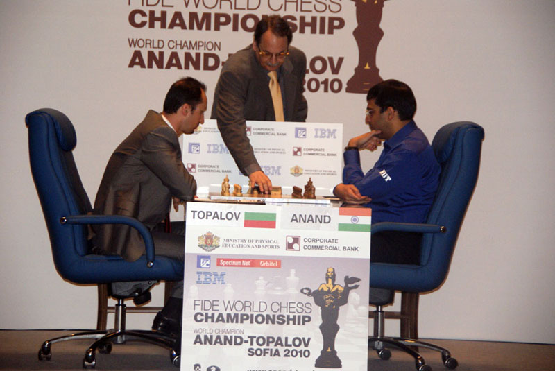 Потом главный арбитр подошел к столику, за которым ждали Ананд и Топалов, и пустил часы Топалова.