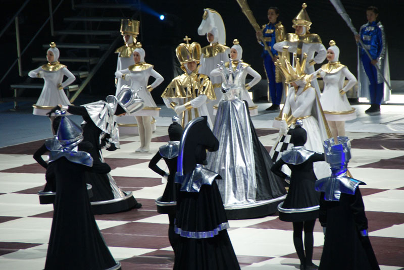 Но гвоздем представления (на мой, конечно, взгляд) были "живые шахматы". Артисты, одетые в изысканнейшие костюмы, разыграли "Бессмертную" Адольфа Андерсена и Лионеля Кизерицкого. И сделали это на редкость красиво и изящно! Сначала появились пехотинцы, легкие фигуры и ладьи.