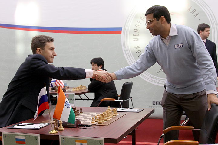 Виши с Сергеем, которых посадили за центральный столик, представляли ту еще парочку. Чемпион мира единственный из всех не надел пиджака, Ананд сел за стол в небесно-голубом свитере, делая вид, что так и надо. Соперник был подчеркнуто элегантен - костюмчик с иголочки и ослепительно белая рубашка. Для того, чтобы сойти за денди, Карякину не хватало разве что бриллиантовых запонок. Но в том, как он брал тонкими аристократическими пальцами фигуры и, поднимая их по высокой дуге, переносил к нужной клетке, чувствовался стиль.