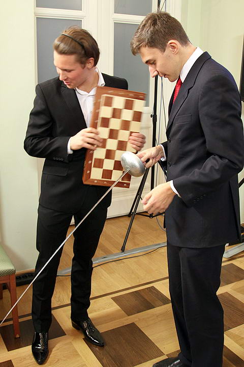 Сергей Карякин... Тот да не тот - не шахматист, а чемпион Европы по пятиборью. Оказалось, что двух Сергеев недавно познакомили, и каждый немного переживает за тезку, хотя один Карякин (пока) не умеет играть в шахматы, другой - ни скакать на лошади, ни фехтовать... Вот это недоразумение и решили, клятвенно пообещав друг другу, исправить, прилюдно обменявшись комплектом шахмат и шпагой.