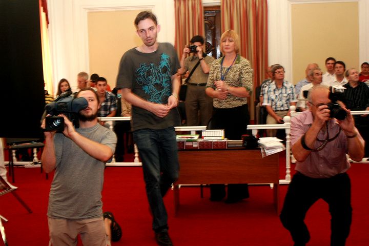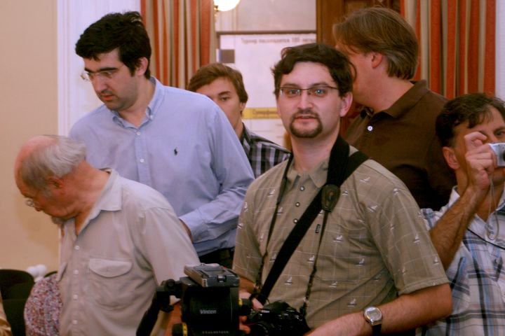 Сквозь зрителей и журналистов пробираются Владимир Крамник и Сергей Карякин