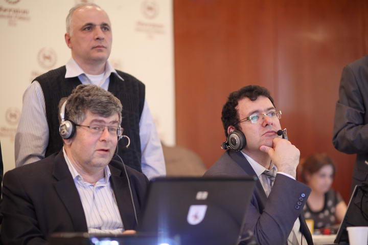 Президент Грузинской шахматной федерации Гия Гиоргадзе и чемпион мира по шахматной композиции Давид Гургенидзе заняли места в зрительном зале.