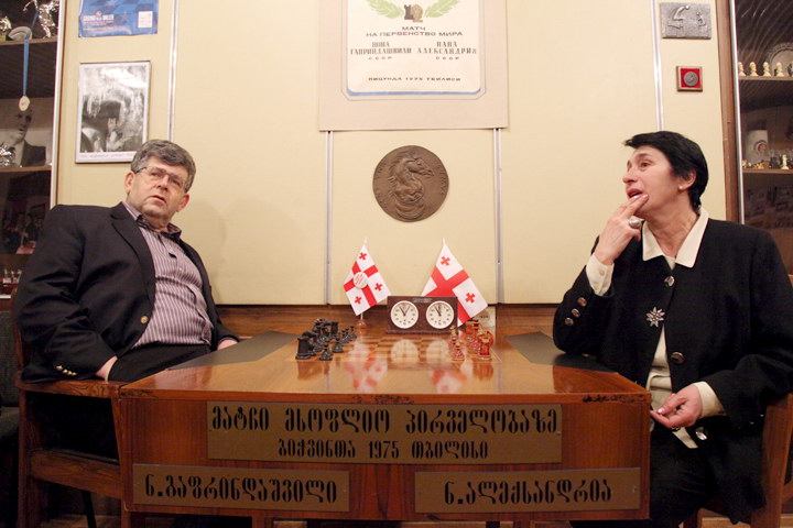 Нана Александрия присела вместе со своим бывшим тренером Марком Дворецким за шахматный стол, за которым игрался матч с Ноной Гаприндашвили в 1975-м. Вспоминали былые времена, многочисленные шахматные события, проходившие в Грузии. «Быть может, если бы мы начали работать с Вами раньше, я бы выиграла больше матчей», - с улыбкой сказала Нана Марку Израилевичу.
