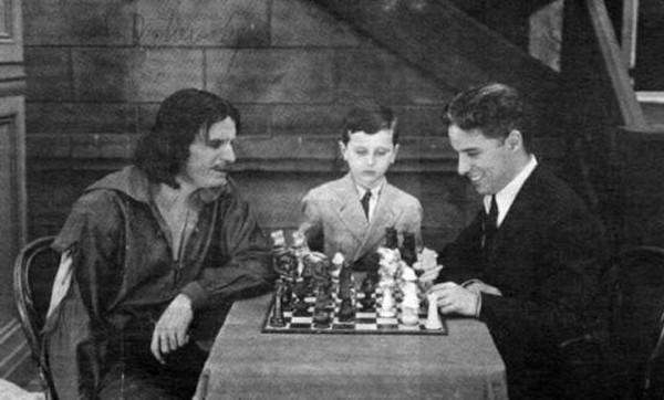 Чарли играет со своим другом Дугласом Фербенксом-старшим, Сэмми наблюдает, и, вероятно, подсказывает ходы обоим любителям шахмат – голливудским звездам.
