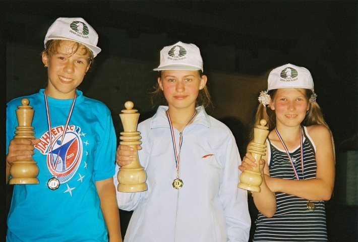 Год спустя, на детском чемпионате Европы в черногорской Будве. Основной турнир с классическим контролем закончился для меня и Оли Гиря без медалей, а Лена стала второй. Но зато в быстрые все 3 приза - наши! Не могу не упомянуть также результат Анастасии Боднарук, выигравшей классический турнир в моей возрастной группе с результатом 9 из 9!!