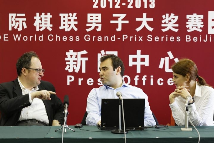 Фотоотчет Александра МОТЫЛЕВА о пятом этапе Гран-при в Пекине поначалу имеет обычную структуру: виды города, портреты участников, сценки в турнирном зале, пресс-конференции, награждение… Начиная со 131-го кадра, требуются небольшие пояснения. 131-138– фотокорреспондент забрел на турнир по го; 139-142 – он в паре с Александром Грищуком играет в настольный теннис против Бориса Гельфанда и Александра Хузмана (камерой в этот момент орудует Анастасия Карлович); 143-161 – на турнире постоянно присутствовали или временами его навещали музы – Цзюй Вэньцзюнь, Хоу Ифань, София Леко, пресс-атташе Анастасия Карлович и арбитр Анастасия Сорокина; 162-170 – сюжет «на десерт»: Василий Иванчук за минуту до начала тура вдруг осведомляется, может ли он налить себе чаю, получает заверения от судьи и партнера, что правило zero tolerance применено не будет, и отправляется к чайному столику. Все довольны.