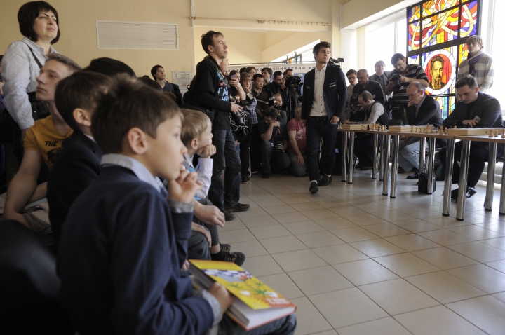 8 апреля Магнус Карлсен по приглашению Ассоциации выпускников Физтех-Союз и Runa Capital.гостил в Долгопрудном у студентов и преподавателей Московского физико-технического института. Чемпион мира ответил на многочисленные вопросы любителей шахмат и дал сеанс одновременной игры. Ведущей вечера была Тина Канделаки.