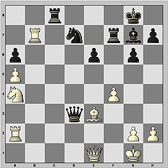 17…Qc7 (угрожая Qf4+) 18.Bg3 (зная дальнейшее, белые, возможно, сыграли бы 18.Bxf6!? Nxf6 19.Nxf6+ gxf6 20.Rd3 f5 21.Rh3) 18…Qa5!! Замечательно красивая комбинация, связанная с жертвой двух фигур, но ведущая, к сожалению, лишь к форсированной ничьей.