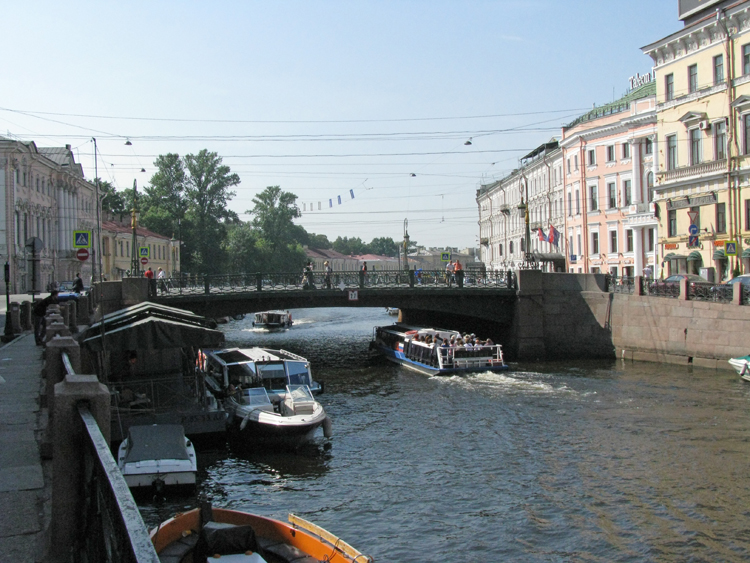 Не Кокушкин (он остается в стороне от нашего маршрута), но зато сразу через несколько: через Фонтанку, канал Грибоедова и Мойку, — чтобы посмотреть на красоты центра Санкт-Петербурга и памятные шахматные места Невского проспекта.