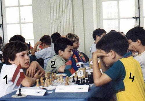 А вот здесь попрошу задержаться (спасибо безымянному автору гостевой, оставившему этот реликт). На фото заключительный тур детского чемпионата Европы «до 10». За центральным столиком играют Найдич (1) и Раджабов (4), рядом – Гусейнов (2) и Рязанцев (5). Та партия закончилась 14-ходовой ничьей и принесла Аркаше первый в его карьере титул. Ничего особенного? А как вам тогда дата – 17 июля 1995 года! Не находите совпадений? Да-да, с того момента прошло ровно десять лет, на что не преминул указать Найдич-старший.