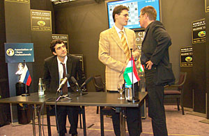 А потом в самом конце пресс-конференции произошел еще один весьма любопытный момент. После официальной части ведущий обычно передает микрофон журналистам, те могут задавать любые вопросы – так вот после короткого диалога, когда соперники уже начали подниматься со своих мест, к столику с участниками направился менеджер Крамника и Леко Карстен Хэнзель. И тут… какой-то зазевавшийся журналист вдруг попросил микрофон. Володя, едва поднявшись, стал вновь опускаться на стул, а Хэнзель и Леко, который уже успел встать, при этом начали что-то оживленно обсуждать по-немецки (на языке, которого Крамник не знает). Чуточку недоуменный взгляд чемпиона говорил сам за себя – немецкий менеджер, кажется, четко для себя все определил, за кого из двоих он болеет в этом матче.