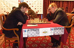 Цешковский играет черными с Грищуком. Вчерашней яркой победой Виталий Валерьевич заставил пессимистов, к числу которых причисляю и сеСпасибо, я только рад. На мой взгляд, главная проблема прославленного гроссмейстера – дебют. Не знаю, можно ли против Грищука выходить в «Уфимцева»? Белыми Александр играет очень агрессивно. Так что… ставлю на молодого.бя, на время примолкнуть: есть еще порох в пороховницах!