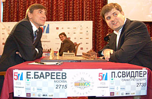В предыдущем туре первую победу одержал Бареев и вышел в «полтинник». На той же позиции находится и Свидлер. Есть возможность слегка так, по-дружески, подтолкнуть «товарища» плечом, а потом лишь покоситься в его сторону сверху вниз. Ранее это несколько раз удавалось сделать Петру, но вряд ли он захочет расстроить друга в его день рождения?! Так что не будем углубляться в статистику их взаимоотношений. Только в этом году они встречались уже трижды: сначала Свидлер вышел победителем в Вейк-ан-Зее, потом выиграл «слепую» партию в Монако, а рапид там же завершился миром…