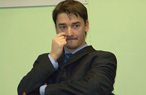 Если партия не отняла у него много сил (такая, например, как ничья с Крамником), Микки может заглянуть в пресс-центр, нацепить непривычные очки и в духе английского юмора пошутить с секундантами других участников над их подопечными…