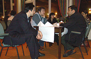 Любопытно, что «группа поддержки» Крамника – исключительно мужская: Карстен Хензель (один на двоих менеджер с Леко), Йозеф – крупный русско-немецкий бизнесмен, старающийся не пропускать турниры с участием Володи (вот и сейчас он приехал лишь на пару последних дней), и Бареев – секундант, который вполне мог бы и сам играть в этом турнире.