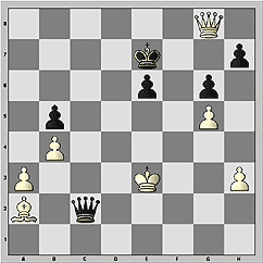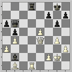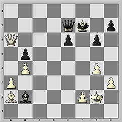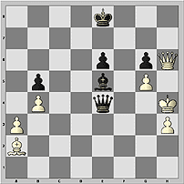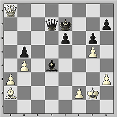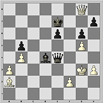 34.Rxd8+ Qxd8 35.Ba2 (выигрыш второй пешки путем 35.e6 fxe6 36.Qxe6+ Kg7 37.Qxa6 вел лишь к вечному шаху – 37...Qd5+ 38.Kg3 Qb3+ и т.д.) 35...Qe7 36.e6! Другого не видно. После 36.f4 уже можно съесть пешку 36...Bxa3, а затем и на b4. К ничьей вело и 36.Qa8+ Kg7 37.Qxa6 Qxe5 – у черных достаточная контригра, далее возможно 38.Qb7 Qf4 39.Qxb5 Qe4+ (можно и сразу взять на a3) 40.Kg1 Bxa3 41.Qd7 Qf4 42.Qa7 (и нет хода 42.b5? ввиду 42...Bc5! - пункт f2 незащитим) 42...Bxb4 43.Bxf7 Kh6 44.Bg8 Qc1+ 45.Kg2 Qc6+ вечный шах или размен ферзей неизбежны.