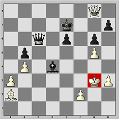 у белых не было защиты! Комбинированная атака пары черных фигур достигала цели. Вся хитрость в том, что после 43.Qxh7+ надо было сделать следующий маневр королем: 43...Kf8! (именно так, приближаясь к белому ферзю, тогда как удаление ничего не давало – 43...Kd6 44.Qf7! и на 44...Be5+ есть 45.f4) 44.Qh6+ Ke8! Теперь шахи у белых кончились, грозит Bd4-e5+, а все попытки защитить короля безуспешны. Например, 45.f3 Be5+ 46.Kf2 Qc2+ 47.Ke3 Bc3! – находить такие тихие ходы в цейтноте крайне сложно – 48.f4 Qd2+ 49.Kf3 Qd3+ 50.Kg2 (50.Kf2 Bd4+) 50...Qe2+ 51.Kh1 Qf1+ 52.Kh2 Qxf4+ 53.Kg2 Qe4+ 54.Kf2 Bd4+ 55.Kg3 (55.Kf1 Qf3+ 56.Ke1 Bc3#) 55...Qe3+ 56.Kg4 Qe2+ 57.Kg3 Be5+ 58.Kh4 Qe4#!