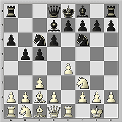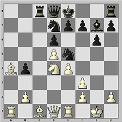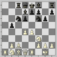 8...c5 (солиднее 8...Be7 9.Nc4 Qe6 10.Ng5 Qg4 11.Qxg4 Bxg4 12.h3 Bd7 13.Nf3 f6 с равной игрой: Крейман – Банджамин, Коннектикут 2003) 9.a4 b6 10.Nc4. Новинка. К сильнейшей инициативе белых привело 10.a5 Rb8 11.Nc4 Qe6 12.axb6 cxb6 13.Ng5 Qf6 14.Qh5 b5 15.Nxf7! Kxf7 16.f4 в партии Козел – Ковалев (Украина, 1999).