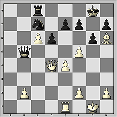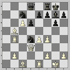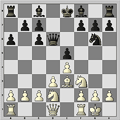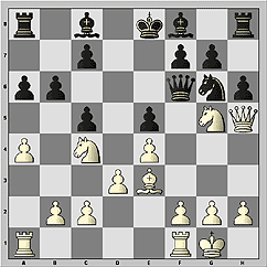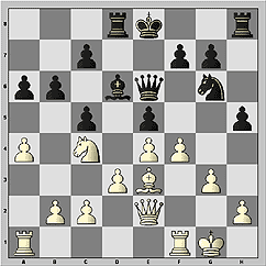 13...Bxh3 14.Qxh3 Bd6 15.Qg4 (15.g3!?) 15...Rd8 16.g3 (явная, неприкрытая угроза) 16...h5 17.Qe2. Размен ферзей вел к потере пешки – 17.Qf5?! Qxf5 18.exf5 Ne7) 17...Qe6. На 17...h4 есть возвращение королевы – 18.Qg4!