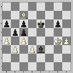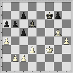35...g6 36.Kg4 Ke6 37.Bd2 Be7 38.Bf4 c6 39.c4! (все по белым полям!) 39...b5 40.b3 Bf6 41.Be3 Be7 42.Bf4 Bf8 43.Kg5 Kf7 44.Kg4 Kf6 45.Bg3 Bh6 46.Bd6 Be3 47.Bg3 Ke6 48.Bc7. Ничья.