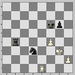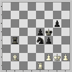 36.Rc5 (сильнее 36.fxg6 hxg6 37.b4) 36...f6 37.fxg6 hxg6 38.Be3 Rb7 39.Bd4 Kf7. У черных компактнее расположены пешки, все защищено. А у белых все боевые единицы разбросаны по доске. Любой блицор знает, что это резко затрудняет игру. К тому же на флажке сказывается специфическое блиц-преимущество коня над слоном – его прыжки трудно увидеть за секунду, другую. А вот движения слона просты и логичны. Их не зевнешь!