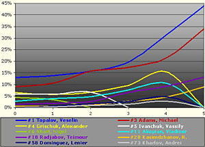 Резюмируя, сделаю предположение, что в финале все-таки встретятся сильнейшие: Топалов и Адамс, а победит Топалов. В подтверждение – забавная шкала «вероятности победы» от Джефа Сонаса (ChessBase). Слева – процент вероятности победы в чемпионате, внизу – круги «нокаута»: от первого до пятого.