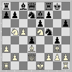 10...g5!? Рискованный, но логичный ход. Почему бы не съесть сладкую пешку белых в центре? 11.Bg3 g4 12.Ne5 Nxd4 13.Qd2! Nf5! [Прибавлть к пешке еще и ладью не стоит – 13...Nb3 14.Qxh6 Nxa1 15.h3! и черный король беззащитен.] 14.Bd3 d4 15.Nb5 [Заслуживало внимания 15.Ne2 , перебрасывая фигуры поближе к черному королю.] 15...Nd7