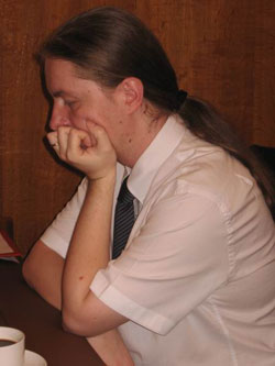 13...axb5 14.Nxb5 Qc5 15.b4 Qb6 16.Bf2. После длительного, чуть ли не часового обдумывания, Рублевский принял предложенную Грищуком ничью. После 16.Bf2 Сергей, насколько я понял, считал основной линией 16...Qd8 (в случае 16...Qc6 17.Na7 Nc4 18.Bxc4 Qxc4 19.Nxc8 Qxc8 Рублевский опасался 20.c4!? с идеей 20...Qxc4 21.Rc1 - хотя это, конечно, довольно неясно) 17.Nxd6+ Bxd6 18.Qxd6 Qxd6 19.Rxd6 Bxe4 20.Bg3!? и т.д. - с примерным равенством. Вместо 16.Bf2 не проходило 16.Nxd6+? Bxd6 17.Qxd6 ввиду 17...Nc6! с перевесом черных. Именно этого и не заметил Грищук, когда предпринимал жертву фигуры на 13-м ходу.