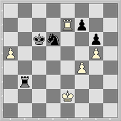 Две пешки на разных флангах зачастую являются достаточной компенсацией за коня. К примеру, если в данном положении убрать с доски ладей, то черные никак не могли бы рассчитывать на выигрыш. А вот при ладьях дела белых плохи. Дальнейшее не требует больших разъяснений. 42...Ra3 43.g5 hxg5 44.hxg5 Nd1+! 45.Ke2 Nxe3 46.Rc5 [46.a6 Nd5!] 46...Nf5 47.Rd5 Kf8 48.Kd2 Ke7 49.Ke2 Nd6 50.Re5+ Kd7 51.Rd5 Kc6 52.Re5 Rb3 53.Re7