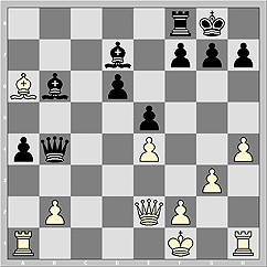 31...Rxg2 Единственный шанс. 32.Qb4+ Kf6 33.Qxb7 Rgg8 34.a5 e5 Начало... нет, не спасительной контригры. Козыри белых все же посильнее. 35.Qf3+ Ke6 36.h4 Rgf8 37.Qg4+ Kd6 38.h5 Rae8 Только активность может спасти черных, так что пешку a6 приходится жертвовать. 39.Qb4+ Ke6 40.Qc4+ Kf5 41.Qxa6 e4