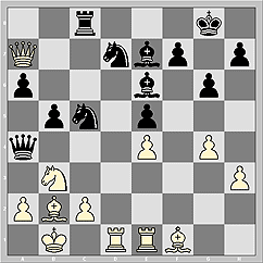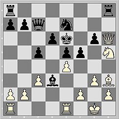 Белые, как говорится, забыли развиться, за что и получают... 16...Re6! 17.Bg3 [В случае 17.Bxg7 Rd8 18.Rd1 Rdd6! 19.Bh8 f6 белые оставались без фигуры.] 17...Nxe3! Мощный и весьма своевременный удар. 18.fxe3 Rd8 Широка доска, а бежать некуда. 19.Qa7 [Совсем плохо 19.Qb2 Rxe3+ 20.Kf2 Qc5! 21.b4 Qa7-+ Минимальные надежды на спасение оставляло 19.Qf4 g5 20.Qf2 Rxe3+ 21.Be2 Bg4 22.0-0 Rxe2 23.Rae1!] 19...Rxe3+ 20.Kf2