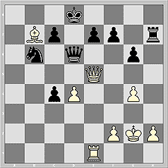 Удивительная позиция! Фигуры черных напоминают некий странный оркестр, в котором каждый исполнитель играет свою партию независимо от других. И тем не менее, этому разобщенному коллективу удается добиться полной гармонии. А гордый король, отослав всех своих верноподданных (действительно, создается впечатление, что все поддали и ушли - кто куда), спокойно защищает самого себя с помощью немногочисленной челяди - пешек c7 и e7.Действительно, очень необычная картина, и что самое интересное, у черных тут - решающий перевес!