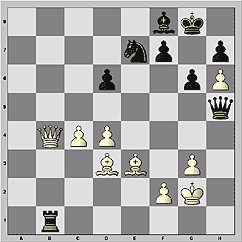 17.Nd2 (белые спокойно следуют своему плану; конь идет на подмогу ферзю со слоном для атаки на пешку d6) 17...Na7. Центральный момент в партии. Петер снова потратил очень много времени, обдумывая прыжок коня. Начинается форсаж. Суть позиции такова: либо черные смогут забрать мою пешку на c3, и тогда у них всё хорошо, либо это им не удается – и тогда они попадают в критическую ситуацию. Более спокойным выбором было 17...Na5 18.Rac1 h6, и у белых, может, лишь немного лучше. 18.Rac1 Nb5 19.Qb3! Возможно, Петер не ожидал этого хода. Но, с моей точки зрения, это – единственный путь к перевесу! Ничего не давало 19.Bxb5 axb5=.