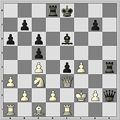 19.Qe3! Несмотря на цейтнот, мне удалось посчитать варианты и убедиться, что Bxh2 не проходит. Напрашивающееся 19.Qh4 было гораздо слабее ввиду 19…g5!! 20.Qxe4 Kd7‚ и угрозы черных приобретают реальные очертания. 19...Bxh2+ (при 19...Rh8 20.h3 Qg6 21.Nxe4 позиция черных разваливается; собственно говоря, стоит мне попасть конем на е4, и судьба партии решена...) 20.Kxh2 Rh8+ 21.Kg1 Qh5 22.f4! Единственное выигрывающее продолжение, которое я должен был предусмотреть, играя 19.Qe3. Всего лишь к лучшему окончанию вело 22.f3? Qh2+ 23.Kf2 Qh4+ 24.Ke2 Bxc4+ 25.d3! (25.Kd1 Bb3+ 26.Ke2 Bc4+) 25...Rxd3 (25...Bxd3+ 26.Kd1 Kf7 27.Bd2+-) 26.Qxe4+ Qxe4+ 27.Nxe4 Rxa3+ 28.Kf2 Rxa1 29.Nd6+ Kd7 30.Nxc4 Rf8. 22...Qh2+. Единственным шансом было 22...Rd4 в расчете на естественное 23.Ne4, после чего черные получали кое-какую надежду: 23.Nxe4? Qh2+ 24.Kf2 Rh3! 25.Qxh3! (25.Ng3 Rxg3! 26.Qxe6+ Kd8) 25...Bxh3 26.Ng5+ Kf8 27.Nxh3 g5, и тут еще не все так просто. Однако я видел эту идею и собирался сыграть 23.Kf2, отражая все угрозы. 23.Kf2 Rh4.