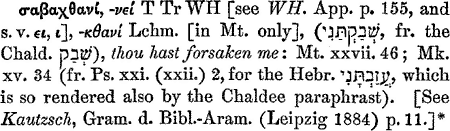 Класс. Второе слово, написанное на иврите - это азавтани. А вот первое, написанное ивритскими буквами (шебактани) - это, видимо, на арамейском? Интересно, есть ли этот корень в иврите (ш - б - к), я такого слова не знаю. Видимо переход от шебактани к савахфани возник при переводах через греческий?