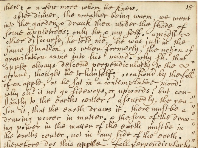| The weather being warm, we went into the garden and drank tea, under shade of some apple trees, only he and myself. Amidst other discourses, he told me, he was just in the same situation, as when formerly, the notion of gravitation came into his mind. It was occasion'd by the fall of an apple, as he sat in contemplative mood. Why should that apple always descend perpendicularly to the ground, thought he to himself. Why should it not go sideways or upwards, but constantly to the earth's center |