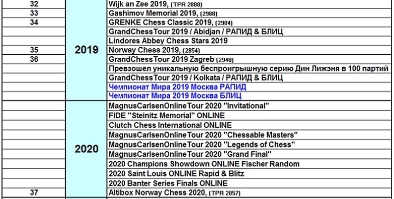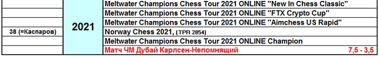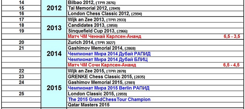 | Необыкновенное постоянство результатов. Хорошо бы в эту таблицу и столбец с количеством титулов (турниры, матчи) добавить. Тогда она получает законченный вид, как мне кажется. |