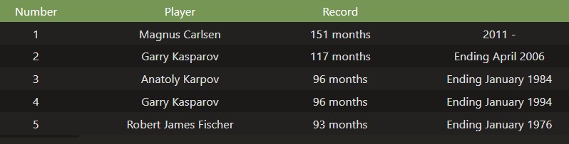 Kasparov's total reign of 22 years was interrupted twice. First by Karpov in 1994, then when Kramnik tied him in January 1996 but lost the top spot due to less games. Carlsen has the longest consecutive streak with 151 months from 2011 as of today in February 2024.