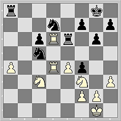 14. Ng3 g6 15. b3 a5 16. a4 b4 17. cxb4 axb4 18. Bb2 Bh6 19. dxe5 dxe5 20. Bd3