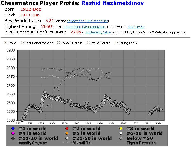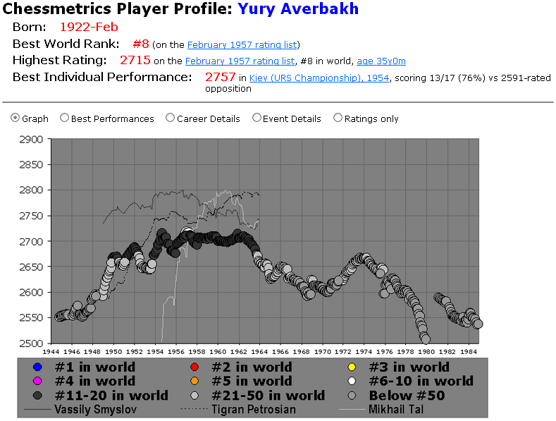 2702 in Tbilisi (URS Championship), 1959, scoring 10.5/19 (55%) vs 2668-rated opposition