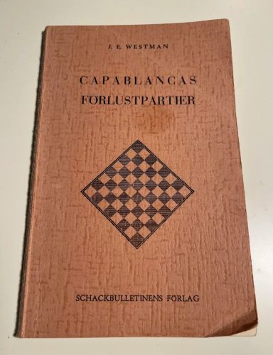 | Это старая книга, изданная в Швеции автором Дж. Э. Вестманом в 1963 году. В ней описаны все турнирные поражения Капабланки за всю его карьеру, и к каждой партии прилагается небольшая предыстория или анекдот. На втором изображении вы видите первую страницу книги. Там описан забавный случай между Капабланкой и Зноско-Боровским. |