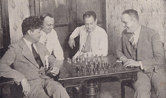 | Сидят (слева направо): Н. КРЫЛЕНКО, Н. Рюмин, ЭМ. ЛАСКЕР, Х. КАПАБЛАНКА, Г. ЛЕВЕН-ФИШ. Стоят: М. БОТВИННИК, Э. ЭЛИСКАЗЕС, А. ЛИЛИЕНТАЛЬ, И. КАН, С. ФЛОР, и В. РАГОЗИН, |