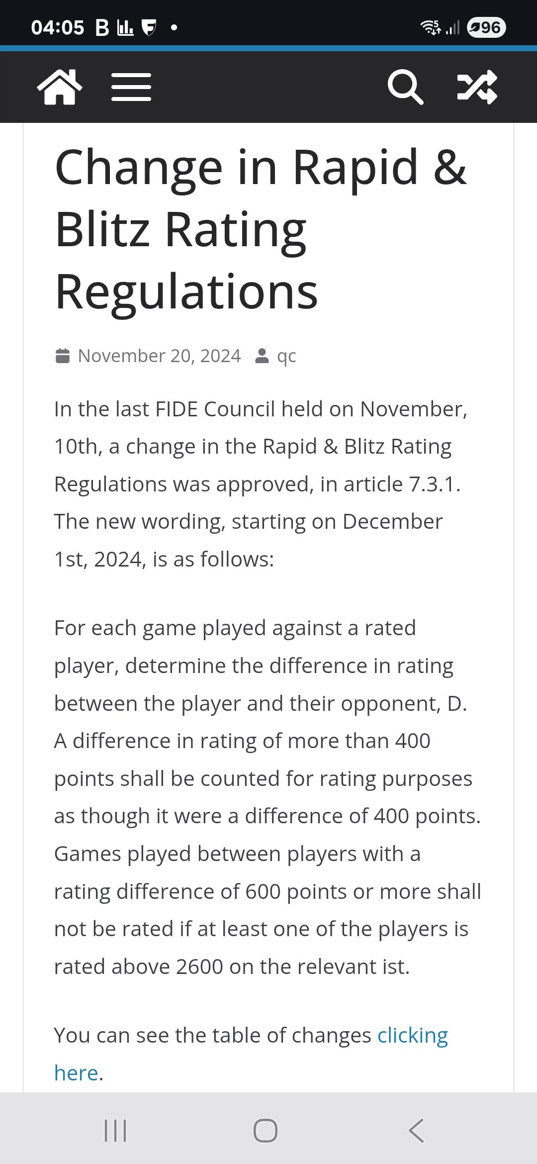 С 1 декабря 2024 года вступило в силу специальное положение, касавшееся только рапида и блица. Оно было направлено против «накрутки» рейтинга и гласило, что партии, где разница в рейтинге соперников составляет 600 и более очков, не учитываются в зачёт FIDE по рапиду и блицу, если хотя бы один из игроков имеет рейтинг 2600+.