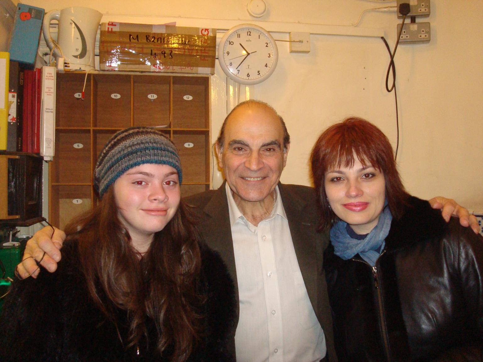 Дочка сегодня вернулась из путешествия Москва-Париж-Лондон-Москва. Ей нравится этот актер. В Лондоне она пришла в театр, в котором играет Суше, объяснила, что приехала на два дня в Лондон и хотела бы повидаться с Дэвидом Суше. Все получилось - ее провели в театр (предварительно обсудив эту встречу с актером) и они встретились. На следующий день дочка была на спектакле с Дэвидом Суше, подарила ему цветы и они еще немного пообщались. Конечно, она не фанатка этого актера и не из-за него приехала в Лондон. Просто, так все получилось.