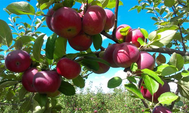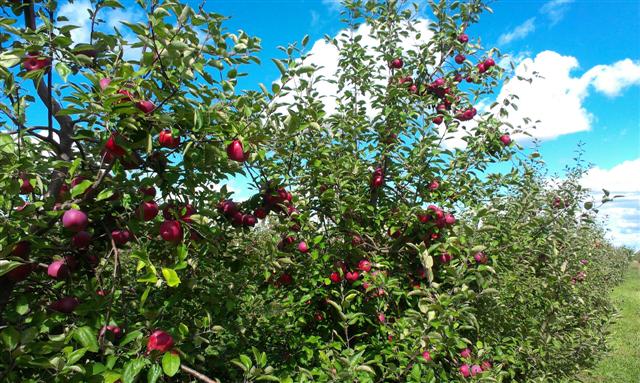 Уж не яблоки ли это! Обычно в конце августа мы собираем яблоки на некой ферме. У них, в частности, растёт "ginger gold" - за ними и охотимся. Но в этом году после поздней весной были заморозки, всё погибло. Вишню достали еле-еле, яблок не было.